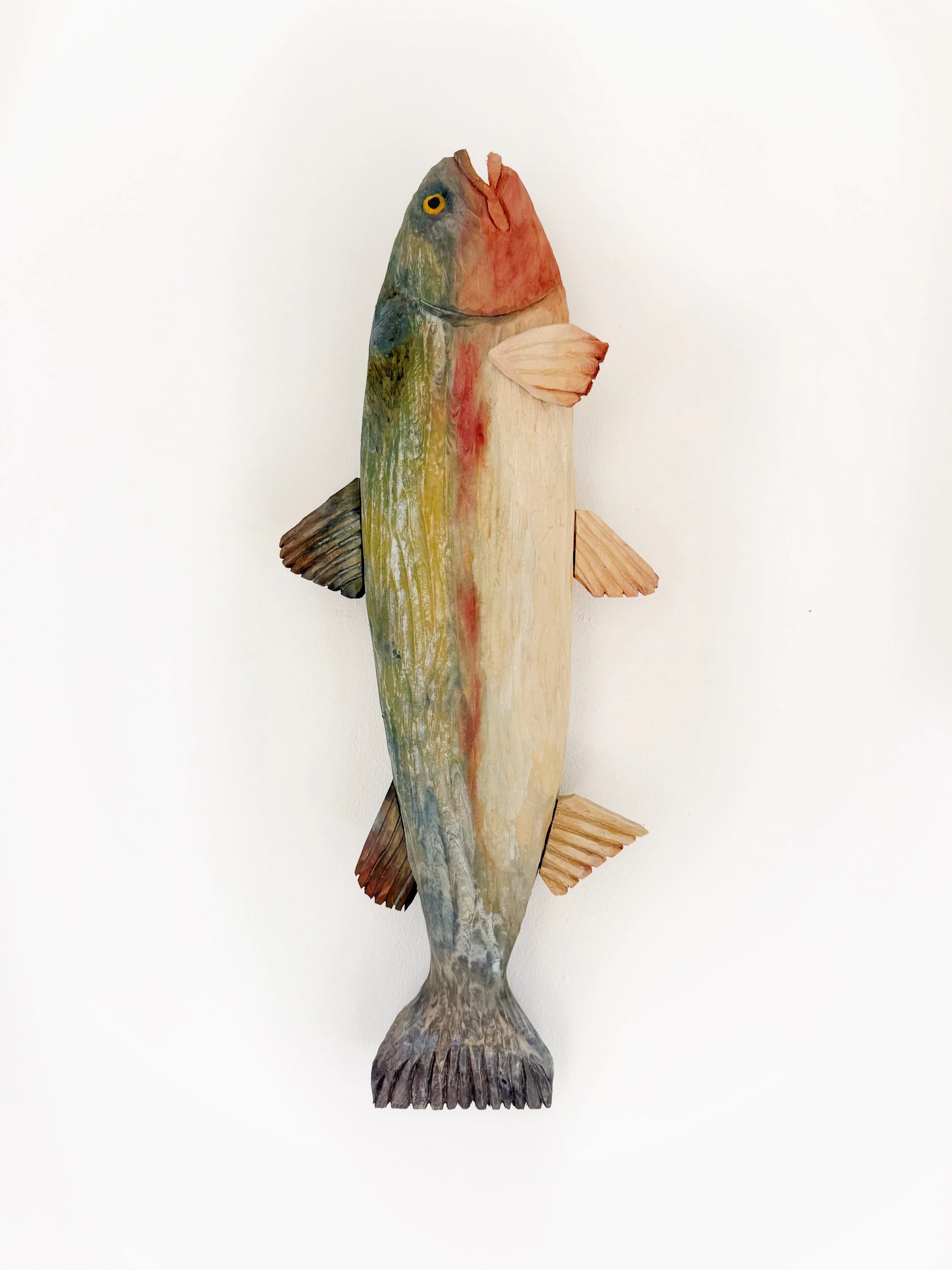 ONE ROAD IN uses hand tools to carve and paint heritage symbols of our natural world. All wood is fallen cedar from the Door County Peninsula.